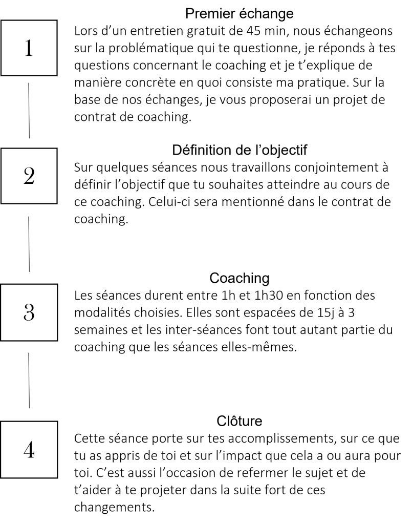 Un nombre de séances est défini lors de l’entretien préliminaire au regard de la demande exprimée mais ce nombre peut être amené à évoluer en fonction de l’avancée du travail.